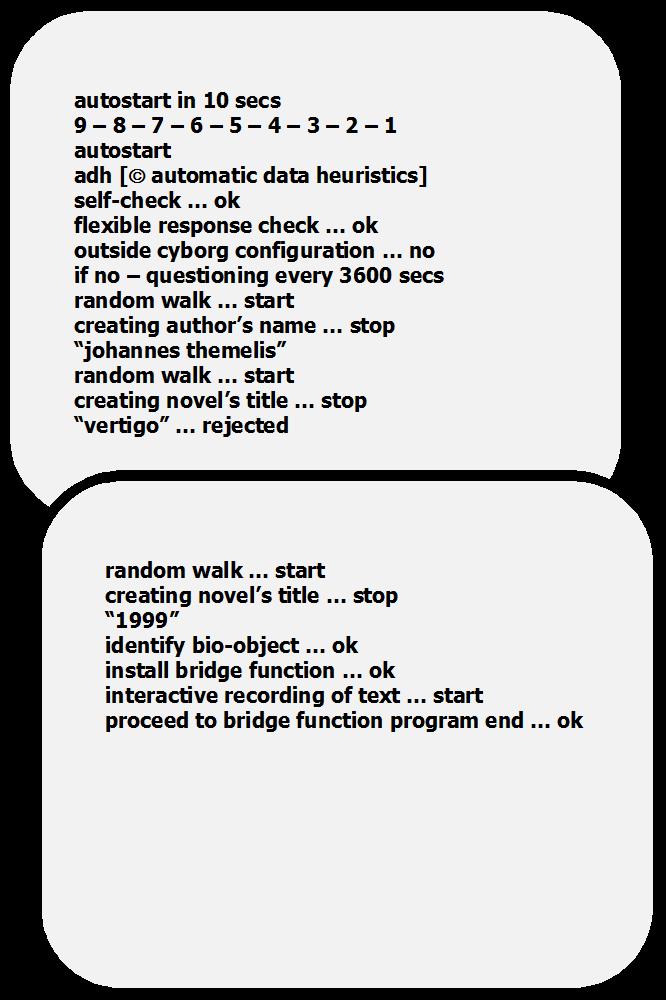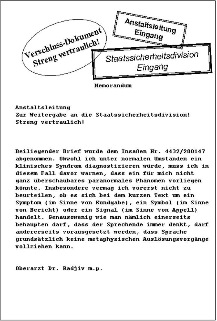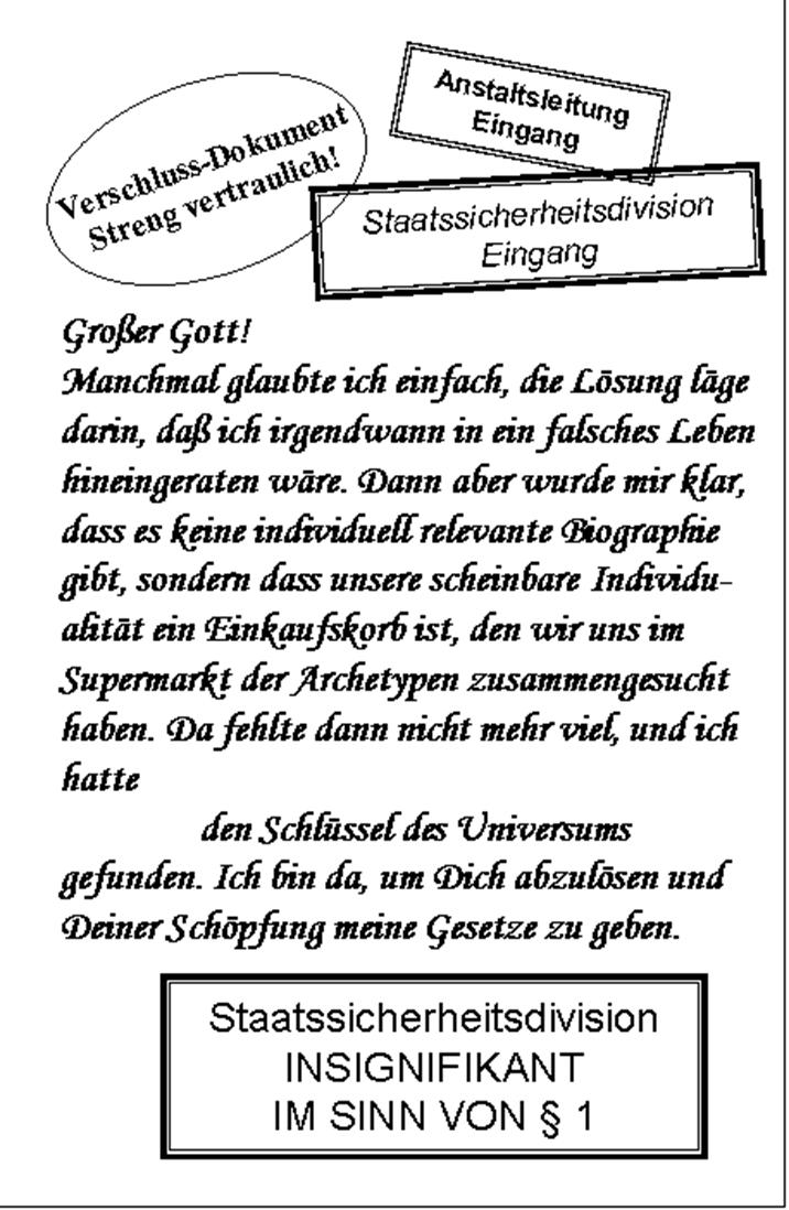 Nein, über ihn existiert das Protokoll seines Anstaltstherapeuten, das ich mit meiner Geschichte verflochten habe. Es enthält so manche verdeckte Botschaft an mich: immerhin hatte er begriffen, dass auch ich Schriftsteller werden wollte –